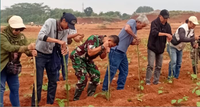 Rangkaian memperingati Hari Pers Nasional (HPN) Wartawan Kota Depok 2025 sejumlah organisasi dan komunitas wartawan berkolaborasi bersama Kodim 0508 Depok melalukan pemasangan penyangga tanaman (Ajir) koro pedang dilahan pertanian Tanah Merah, Cipayung, Depok, Sabtu (22/2/2025).