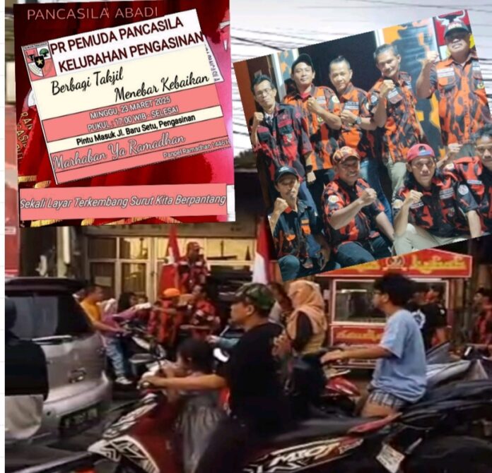 Dalam semangat kepedulian dan kebersamaan, puluhan anggota dan pengurus ranting Pemuda Pancasila Kelurahan Pengasinan, turun langsung ke jalan untuk membagikan makanan dan minuman berbuka puasa kepada para pengguna jalan yang melintas.