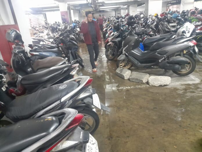 Hujan yang mengguyur Kota Depok pada Kamis 21/11/24 hingga sore hari membuat basement/parkiran motor di gedung Dibaleka II tergenang air hingga mata kaki orang dewasa.