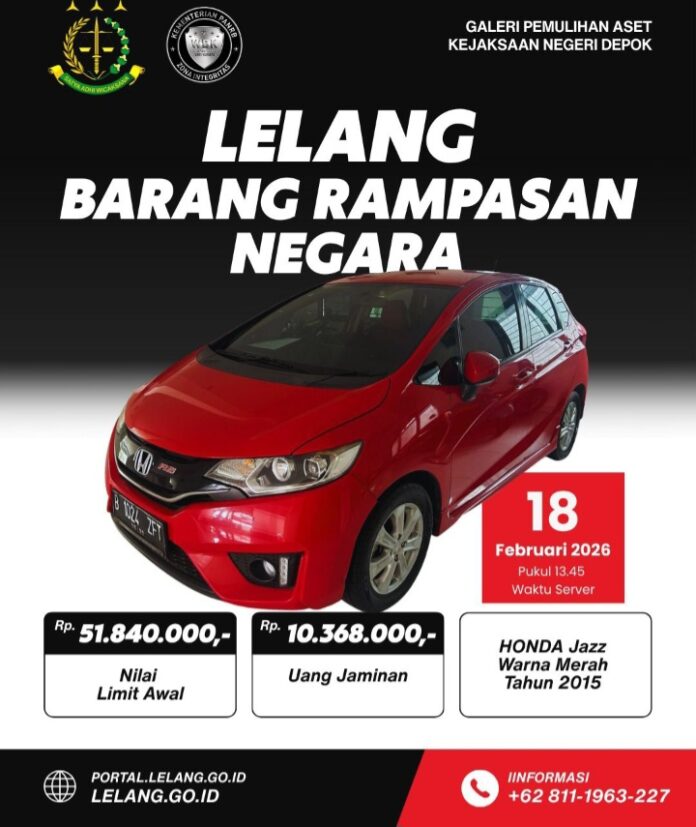 Kejaksaan Negeri (Kejari) Depok akan menyelenggarakan lelang eksekutif barang rampasan negara berupa dua unit mobil Honda Jazz. Kegiatan lelang tersebut diselenggarakan melalui Kantor Pelayanan Kekayaan Negara dan Lelang Bogor (KPKN-LB), dengan tujuan untuk menyetorkan hasilnya ke kas negara.